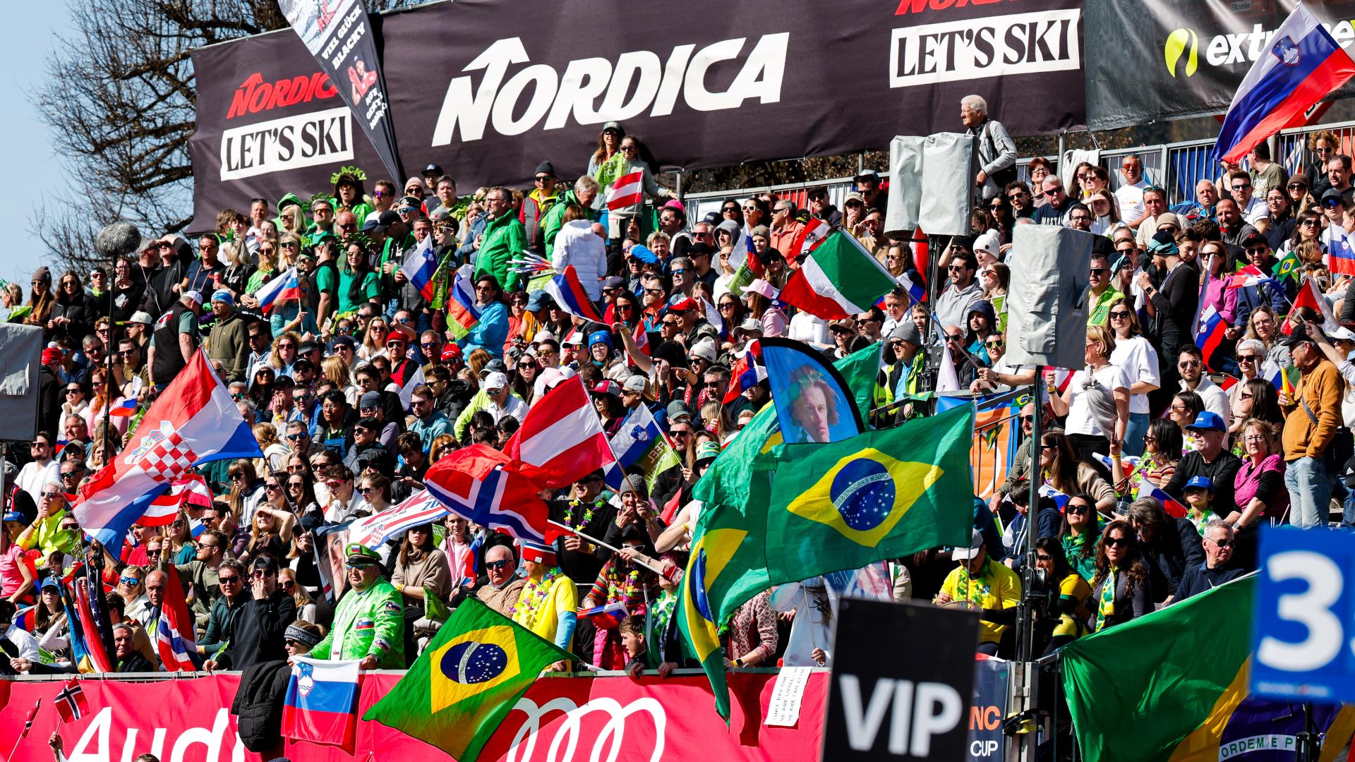 Na vrhu po prvi vožnji sta Norvežan McGrath in Brazilec Pinheiro Braathen, ki imata v ciljni sreni ogromno glasnih navijačev, ki pričarajo pravo navijaško vzdušje. Prišli so člani njunih fan klubov, pa tudi ostali, ki sta jim smučarja pri srcu.
